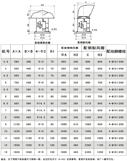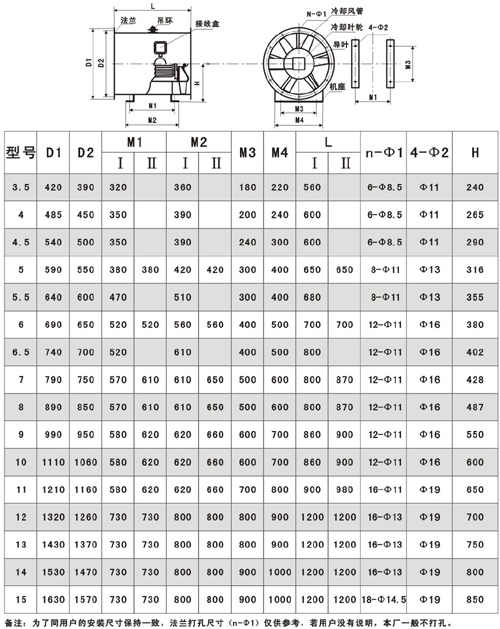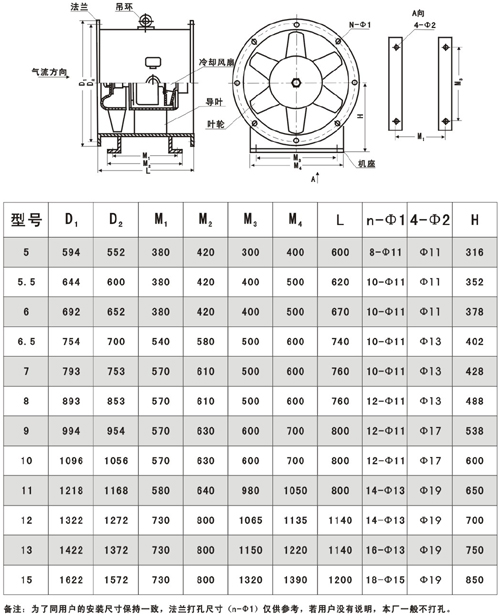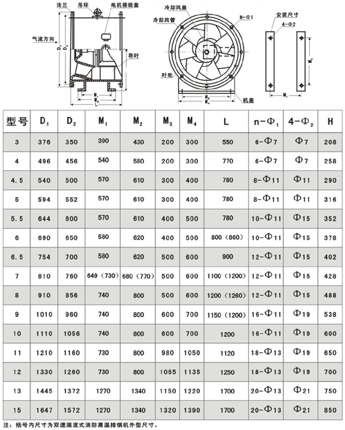 十一.HTF(GYF)-IIG型双速混流式消防高温排烟通风机性能参数表  十二. HTF(GYF)-IG(IIG)型混流式消防高温排烟轴流通风机外形尺寸表